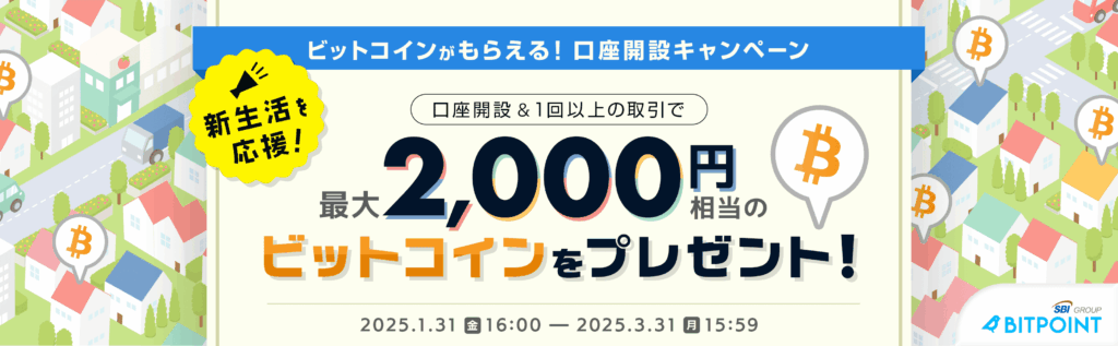 引用元:新生活を応援!ビットコインがもらえる口座開設キャンペーン | 【BITPOINT】暗号資産(仮想通貨)ビットコイン取引ならビットポイント