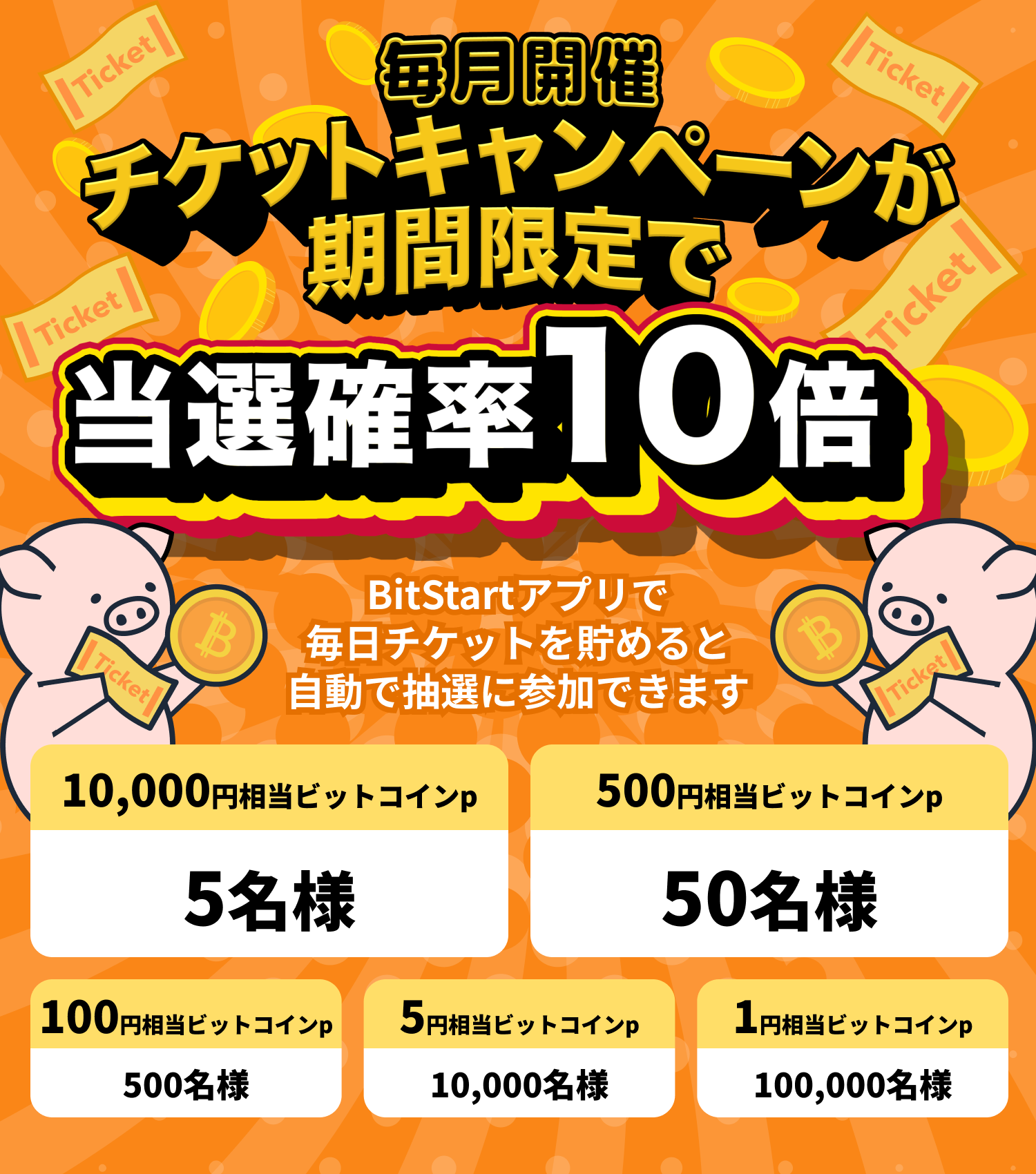 毎月ビットスタートで開催されるイベントに応募するチケットです。 チケットは、下記2つの方法で手に入れることが可能です。 ・アプリの毎日動画チケットにて毎日もれなくチケットがもらえます。 ・ビットスタートに掲載されている案件を実施した際に案件の金額に比例してチケットがもらえます。 チケット1枚につき応募が1回できるので、毎日チケットを逃さずゲットしよう! 今後ほかにもチケットを獲得するためのコンテンツや楽しいイベントをご用意してまいりますのでお楽しみに!